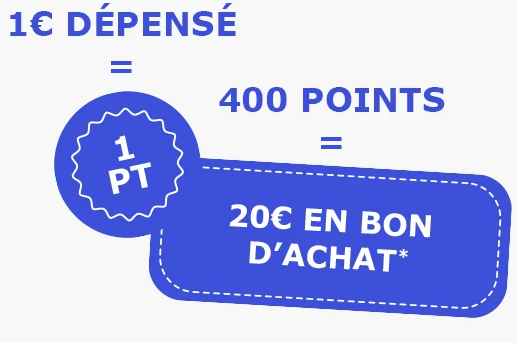 * Sur la base d'1€ = 1 point. Bon d’achat valable dès le lendemain de son édition à partir de 50€ d'achat. Le bon d’achat est valable 3 mois à partir de sa date d’édition et n'est pas cumulable avec une autre remise. Tout retour implique le retrait des points correspondants au montant des produits retournés. Chaque remise n'est utilisable qu'une seule fois, et dans le cas d'un retour, celle-ci est alors perdue. Deux bons de fidélité maximum peuvent s'appliquer sur une même commande.